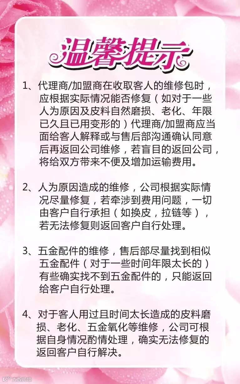 消费者的满意需要我们百分百的努力,同时也需要我们与各代理商/加盟商彼此的遵守与配合售后制度。