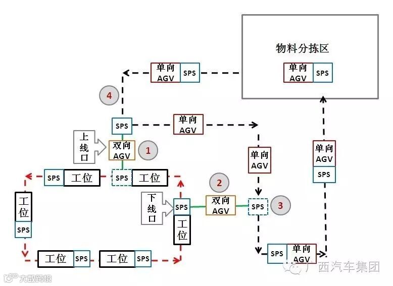 4、单向AGV小车将装满物料的SPS小车牵引送至双向上线AGV小车的运行路线接口处,放下SPS小车。(由此循环运作)
