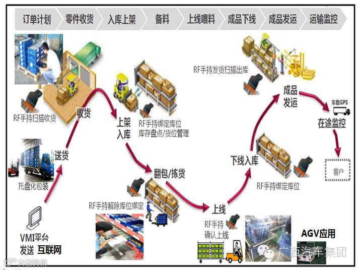 VMI平台通过客户需求确定所需物料清单,库房人员扫码后,外来物料信息自动录入网络,通过手持绑定和解除库位实现对产品进出的管理。同样,通过扫码实现下线产品入库信息登记。全程利用AGV等替换掉厂内人工搬运产品。另外,增强运输车的车载GPS功能,实时追踪运输车的运行情况和车内产品信息。