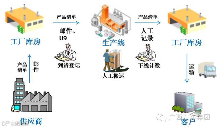 工厂库房收到供应商发来的产品后,人工到货登记,再将产品逐一录入U9系统,公司各部门通过U9系统就可以看到库房产品信息。工厂人员根据生产计划到库房找到零部件,取件后运至产线生产,下线产品人工检查记录并送至成品库房。