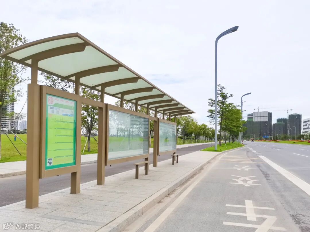 同时,还设有多个公交站台,其中一个站台上已贴上印有097线路图的指示图。