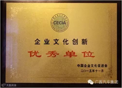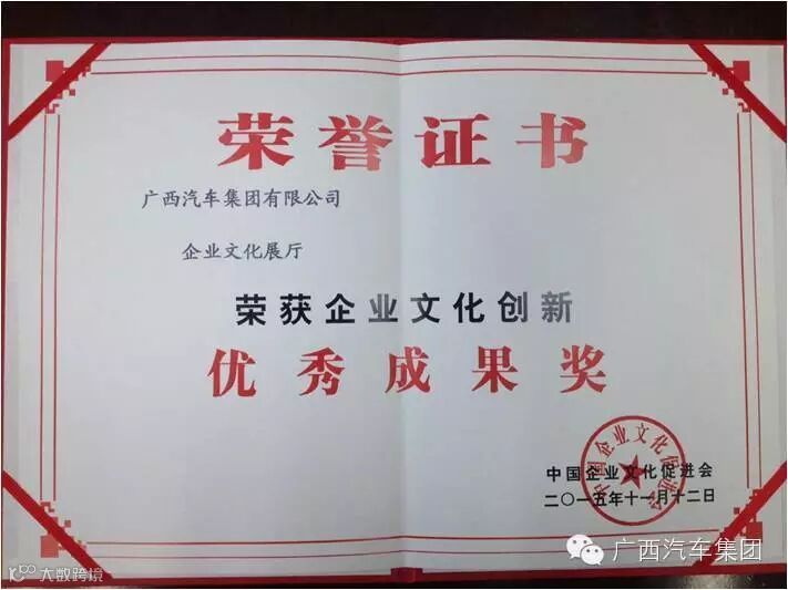 11月,中国企业文化促进会“适应新常态•创新企业文化”研讨会在长沙召开。会上,广西汽车集团获评“企业文化创新优秀单位”,广西汽车集团企业文化展厅获评“企业文化创新优秀成果奖”。