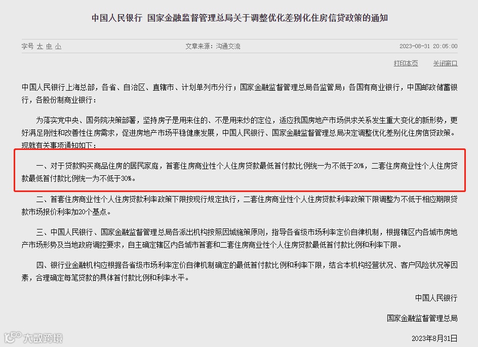 政策利好一波接一波。8月31日,央行、金融监管总局联合发布《关于调整优化差别化住房信贷政策的通知》,重点包括:统一全国商业性个人住房贷款最低首付款比例政策下限。不再区分实施“限购”城市和不实施“限购”城市,首套住房和二套住房商业性个人住房贷款最低首付款比例政策下限统一为不低于20%和30%。可见,购房成本明显降低。