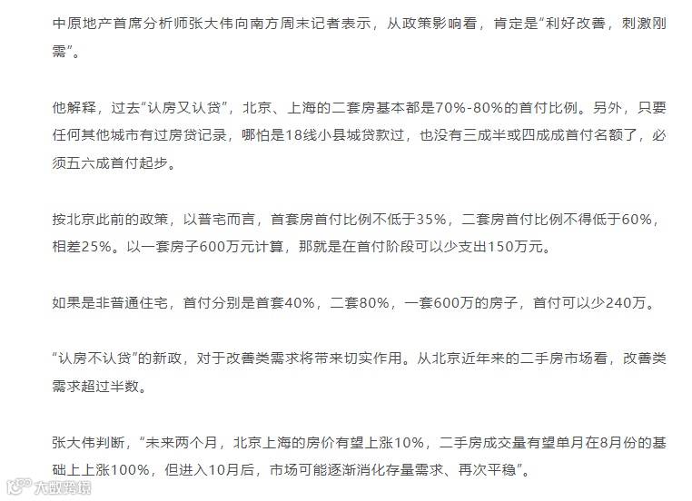住建部、央行、金融监管总局8月25日发布通知要求:首套房贷款“认房不用认贷”新政。即本市居民家庭(包括借款人、配偶及未成年子女)申请贷款购买商品住房时,家庭成员在当地名下无成套住房的,不论是否已利用贷款购买过住房,银行业金融机构均按首套住房执行住房信贷政策。