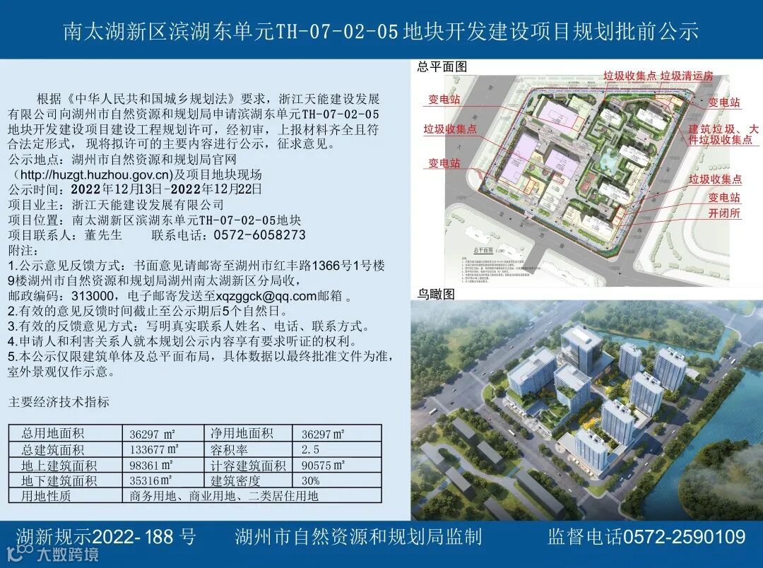 地块总用地面积36297㎡,总建筑面积133677㎡,容积率2.5,建筑密度30%,用地性质为商务用地、商业用地、二类居住用地,包括3幢酒店和5幢高层住宅,将打造一流人才商务和生活服务中心,为天能科技总部、科创园区和天泽府项目提供配套支撑。