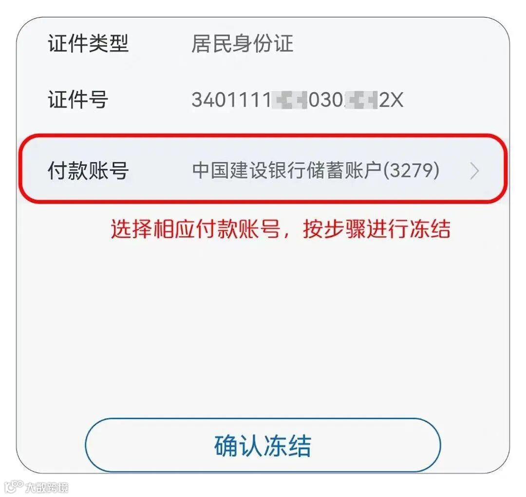 选择相应付款账号,按步骤进行冻结。