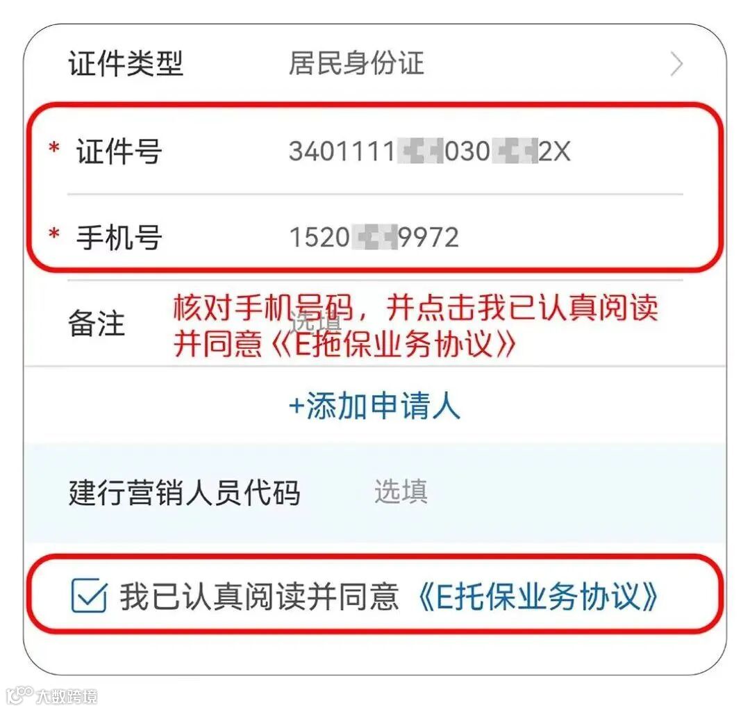 核对手机号码,并点击我已阅读并同意《E托保业务协议》。