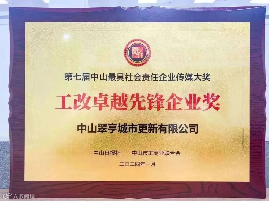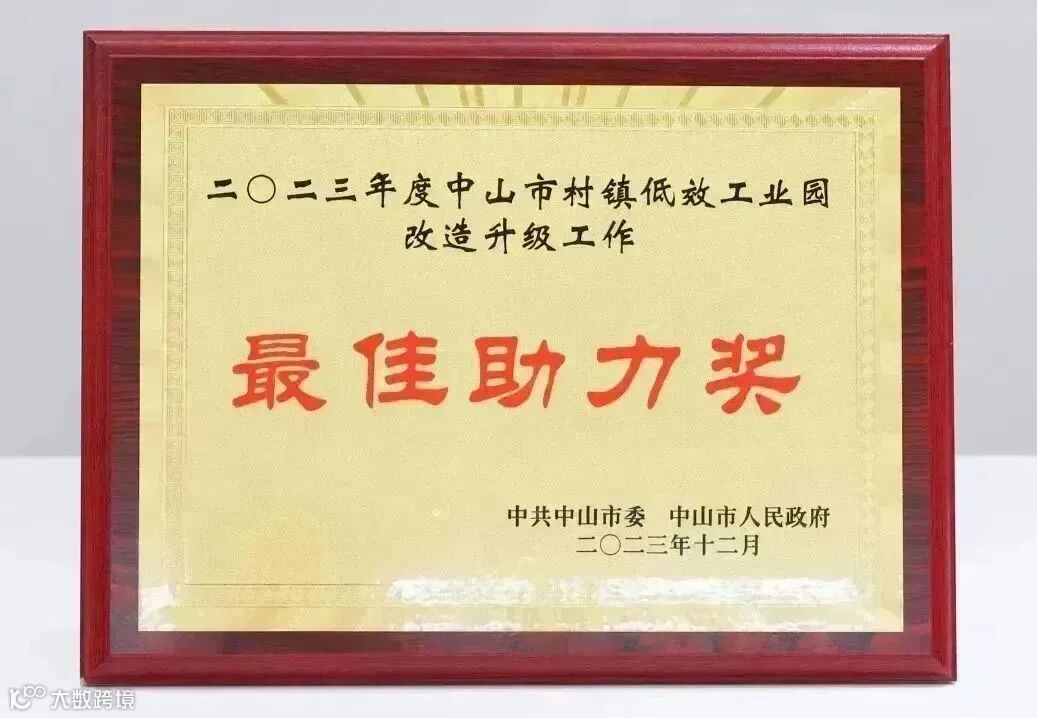 荣获“2023年度中山市村镇低效工业园改造升级工作最佳助力奖”。