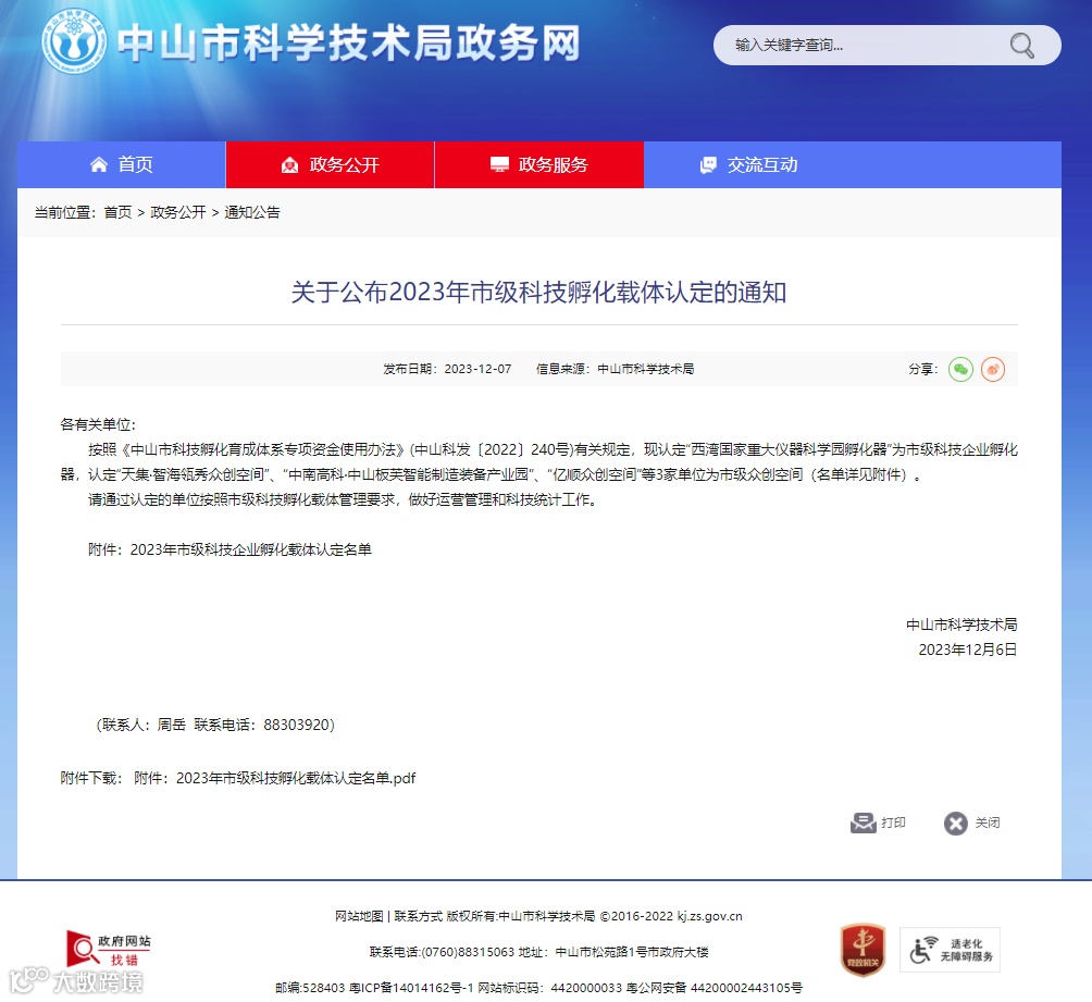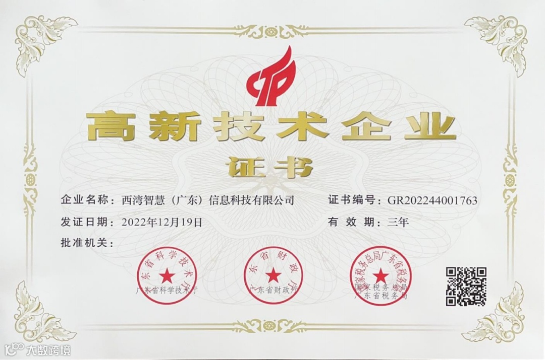 西湾智慧公司成功通过国家“高新技术企业”认定,入选“2022年度广东省专精特新中小企业”,获2023“创新中山”科学技术进步奖二等奖。翠亨国际科创中心智慧园区项目被第十六届中国智慧城市大会评为2023年智慧城市先锋榜优秀案例优秀奖。