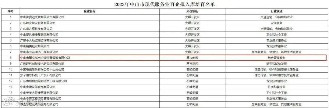 城资公司入选“2023年中山市现代服务业百企拟入库培育名单”。
