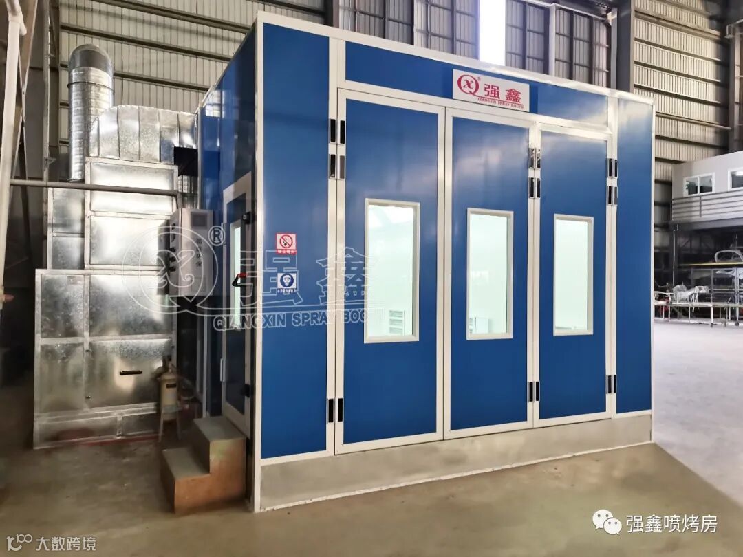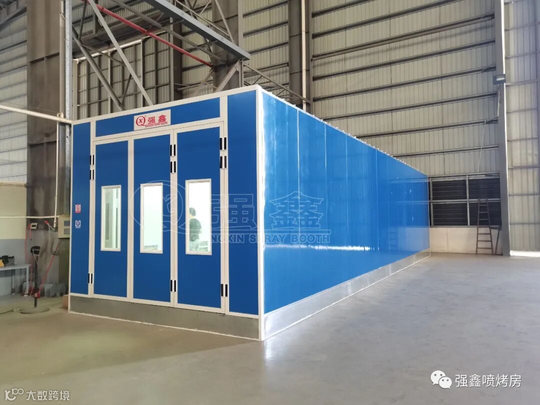 整套喷烤房包含:墙板:全蓝色50mm厚岩棉板,δ=0.526彩钢板。顶板:镀锌板,棉架为不锈钢。 地台:五排地格栅加围板。大门:全蓝色, 配安全压力锁和钢化玻璃观察窗。还采用全防爆照明灯管、两台防爆风机和两套废气处理系统。另外还配备0.8mm厚45米高的镀锌排风管,从而使整套设备符合国家环评标准。