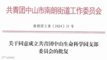 3月19日,共青团中山市南朗街道工作委员会批复同意成立中山生命科学园团支部,为园区青年学习交流、沟通思想、展示自我、锻炼成长搭建了平台,为培育青年人才及创建省市青年文明号、巾帼文明岗打下坚实基础。