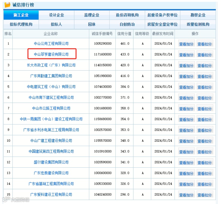 1月24日,在最新发布的中山市建设工程企业管理和诚信平台上,翠亨建工下属中山翠亨建设有限公司(以下简称“翠亨建设”)以433分跃居第二。