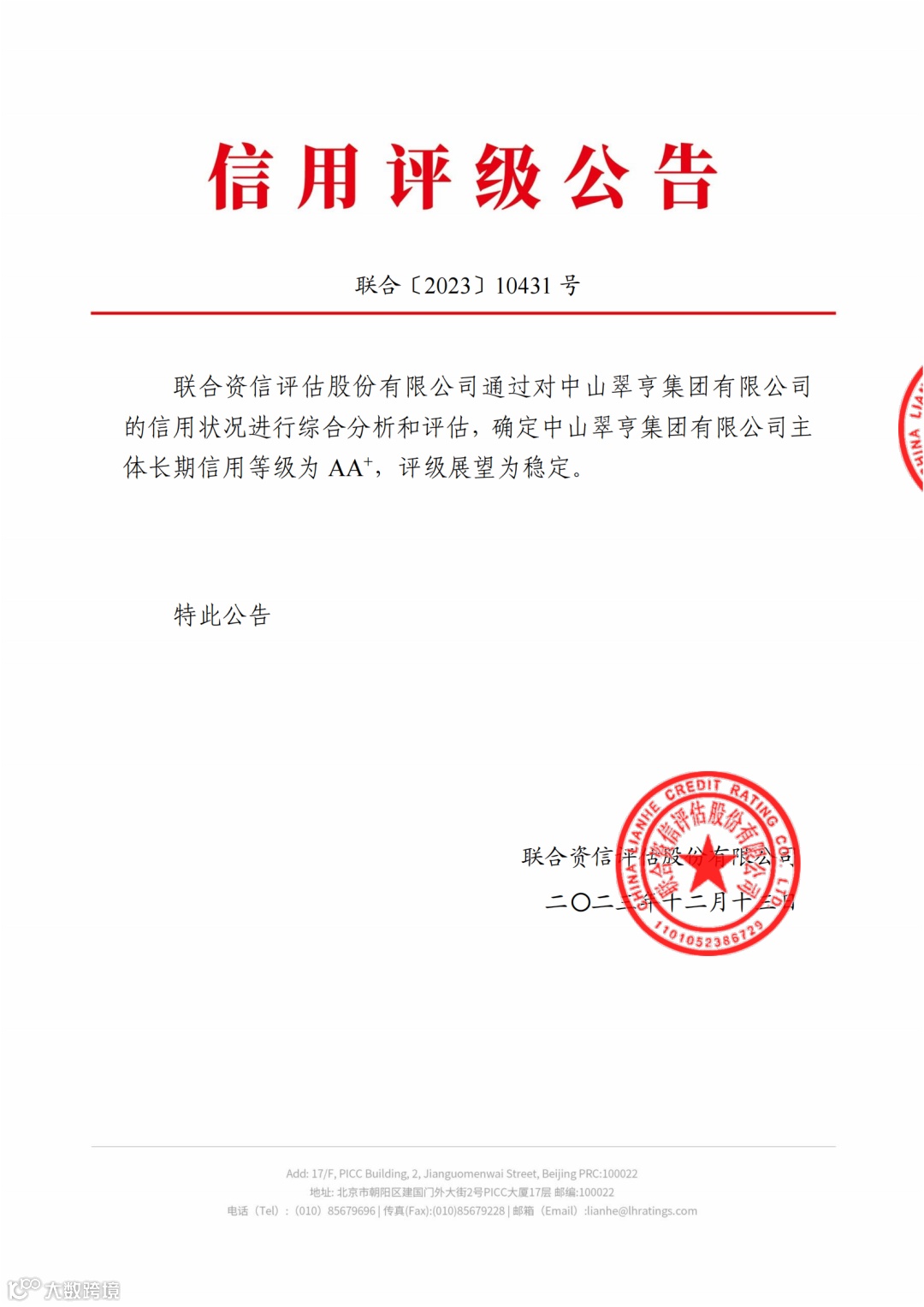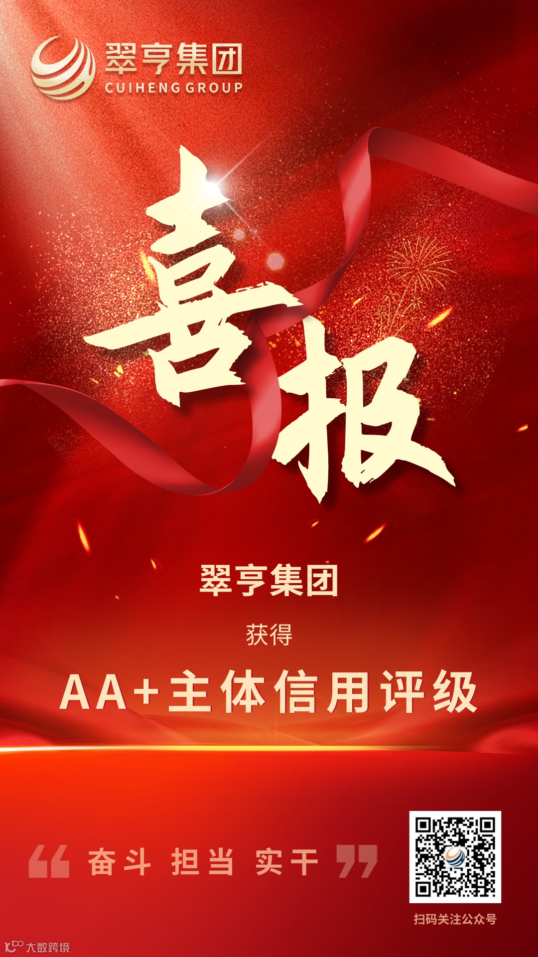 此次获权威机构“AA+”主体信用等级评价,标志市场对翠亨集团管理水平经营能力、风险控制及发展潜力等多方面的高度认可,对翠亨集团抢抓深中通道通车黄金窗口期,实现高质量发展具有重大意义。