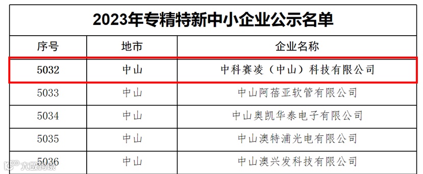 近日,广东省工业和信息化厅公示了广东省“2023年度专精特新中小企业名单”,翠亨集团参股企业中科赛凌中山公司成功入选。
