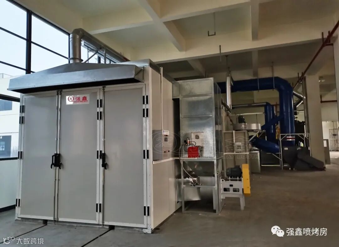 整体框架:烤房主要由高温烤房、喷粉房、水帘房、低温烤房和清洗房五个部分组成,其中包含有天然气燃烧机、塑粉回收柜和手动静电喷粉枪。