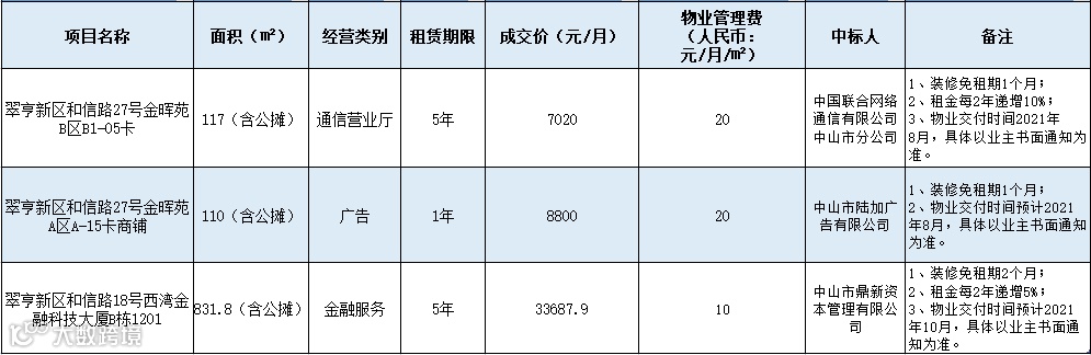 本项目采用竞价方式进行公开招租,鉴于截至2021年7月26日,中山翠亨新区和信路27号金晖苑B区B1-05卡、A区A-15卡商铺;中山市翠亨新区和信路18号西湾金融科技大厦B栋1201的物业均只有1个单位报名,故无需召开现场竞价会确定中标承租人,现就中标人结果公告5天。