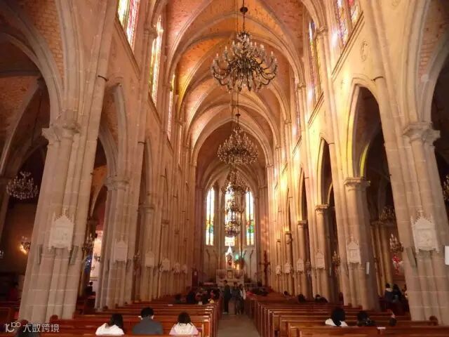 教堂共分为三层,底层开3个尖拱券门,东西两侧的墙下方分别刻有“J enuslem1863”和“Roma1863”拉丁文。;层当中是一用石头雕刻镂空的圆形玫瑰窗,;玫瑰窗上所绘的是圣经故事;三层为钟楼,是从法国运来的大铜钟。