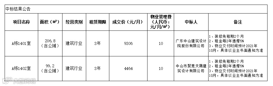 中山火炬开发区临海工业园开发有限公司定于2021年5月10日对中山市翠亨新区和信路18号西湾科技金融大厦A栋14层及B栋15层写字楼物业进行公开招租,本项目采用竞价方式进行公开招租,鉴于截至2021年5月21日,西湾科技金融大厦A栋14层1401及1402室物业只有1个单位报名,B栋15层1503室无单位报名,故无需召开现场竞价会确定中标承租人,现就中标人结果公告5天。