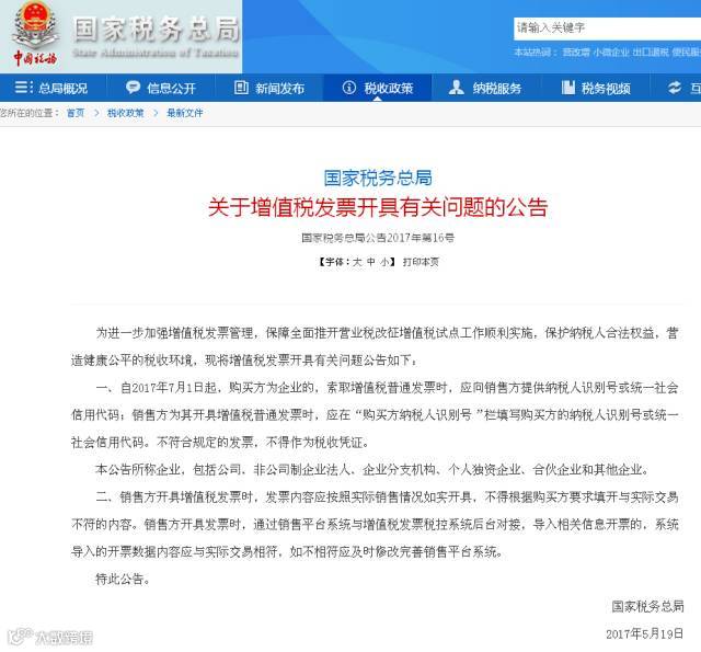 一、自2017年7月1日起,购买方为企业的,索取增值税普通发票时,应向销售方提供纳税人识别号或统一社会信用代码;销售方为其开具增值税普通发票时,应在“购买方纳税人识别号”栏填写购买方的纳税人识别号或统一社会信用代码。不符合规定的发票,不得作为税收凭证。