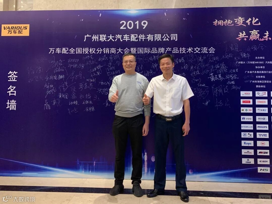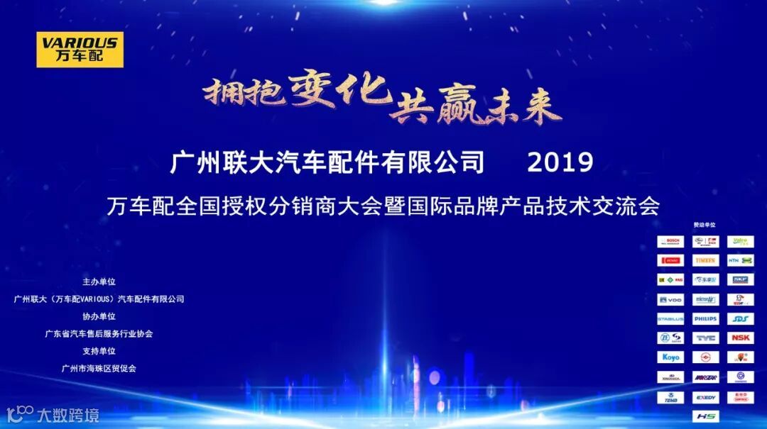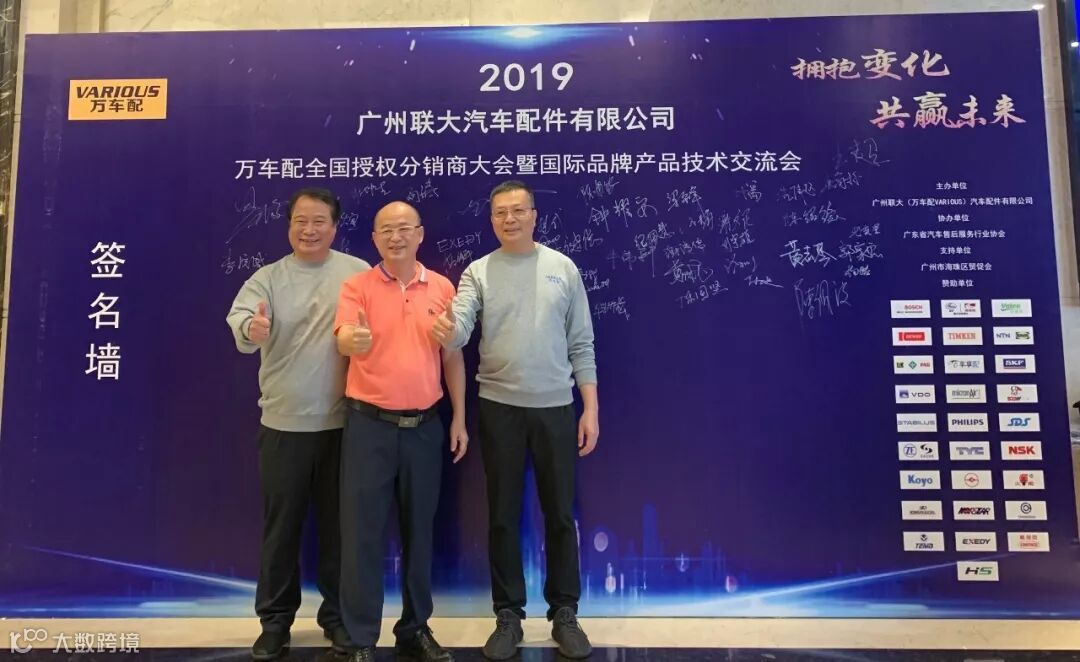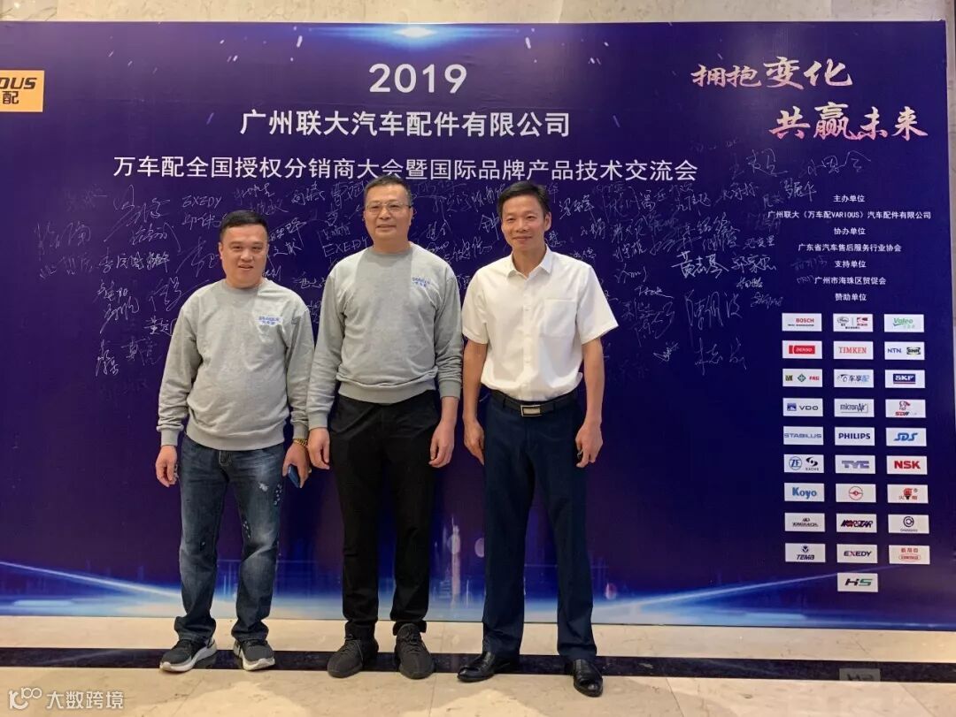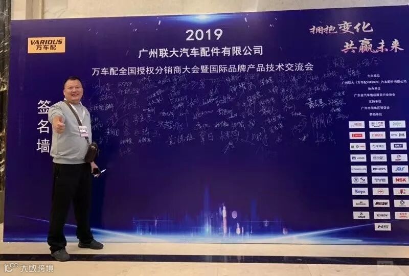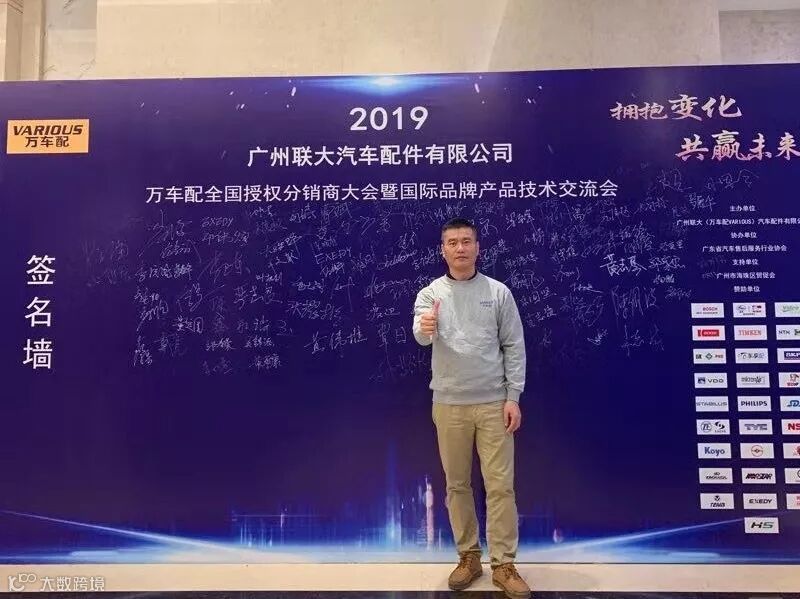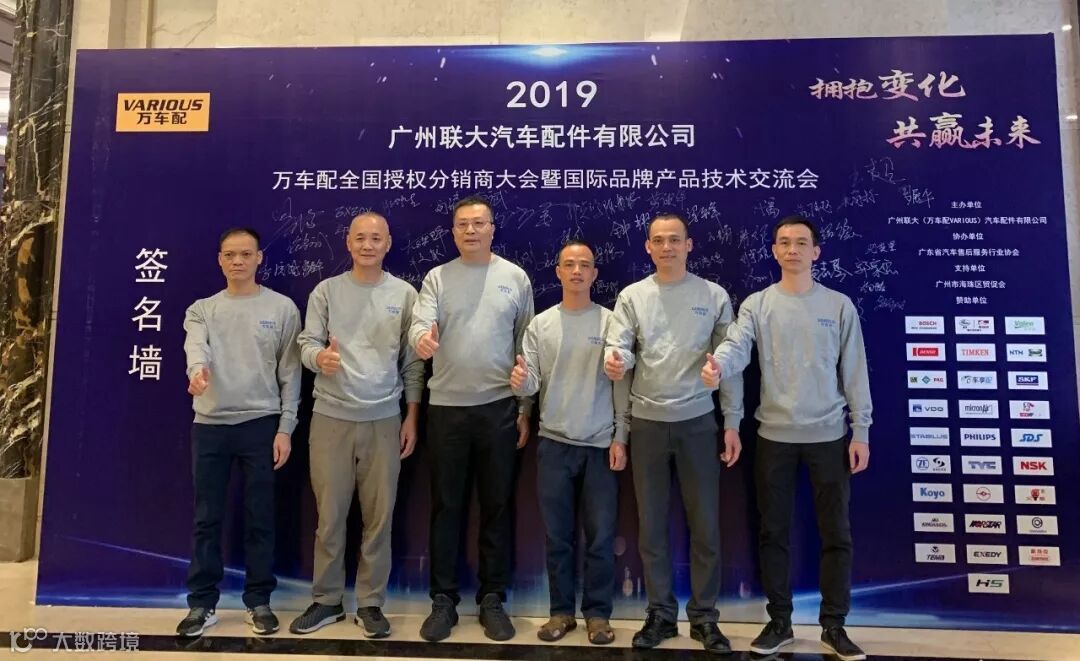 2019年10月11日,在美丽的羊城广州举行了广州联大汽车配件有限公司 — 万车配全国授权分销商大会暨国际品牌产品技术交流会。大会在广州海珠区卡威尔酒店举行,由广州联大汽车配件有限公司主办,广东省汽车售后服务行业协会、广州市海珠区贸促会协办,并有众多国际品牌公司支持,包括:博世、盖茨、法雷奥、日联电装、上海车享、大陆(VDO)、铁姆肯、斯凯孚、恩梯恩、舍弗勒、科德宝、索菲玛、堤维西、飞利浦、采埃孚、斯泰必鲁斯、湘火炬、恩斯克、捷太格特、声佳、纳铁福、无锡永凯达、安徽北泰、曲阜天博、昌辉、上海上制、爱思帝、泰明顿、科帝克、海山舟山等。