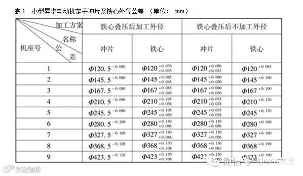 中小型异步电动机定子冲片内外径尺寸精度与其装压方式有关。一般外装压定子冲片,内径一般采用H8,外径精度又与保证定子同轴度的工艺方案有关。