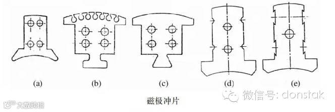 磁级冲片一般选用较厚的(1~2mm)A3或16Mn钢板冲制,图9a为直流电机的一种主磁极冲片,b、c为旋转磁极冲片,d、e为涡流制动器磁极冲片。