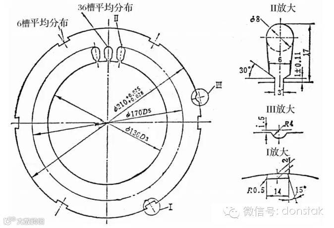 1. 尺寸精度冲片上有多种尺寸,可以归类为“内部尺寸”和“配合尺寸”两种。内部尺寸如槽形尺寸,通风孔、标记槽以及磁极冲片上的孔径尺寸等,一般采用H10,更高的精度等级是没有必要的,因为冲片叠压后,里出外进所造成的误差,远大于冲片本身的误差。冲片内圆、外圆以及轴孔等与其他零件配合的“配合尺寸”,精度等级的选择与所采用的加工工艺有关。