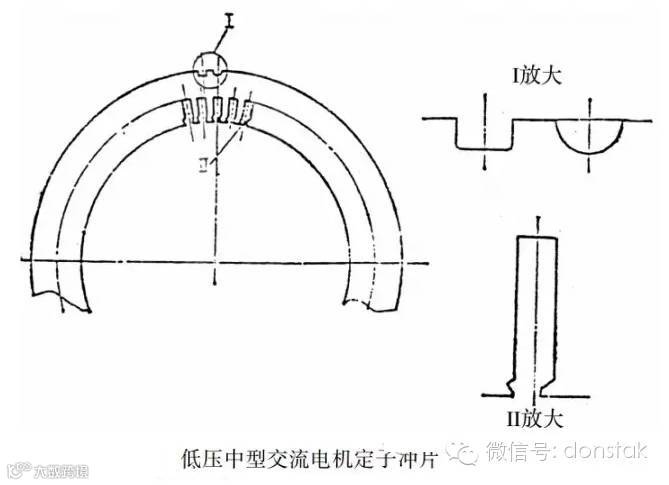 图2-所示是直流电机电枢冲片,带有轴向通风孔(交流电机也有此结构冲片)。这种电枢冲片的槽口没有装置槽楔的小沟,而是一台铁心中有两种不同直径的冲片,直径较小的冲片设置在一定位置,嵌线后在小直径铁心段上绑扎非磁性钢丝或无纬玻璃丝带,以紧固垫条或绕组。