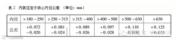 内装压定子冲片一般外径采用H7,内径采用H8。表2列出了内装压定子铁心内径公差。