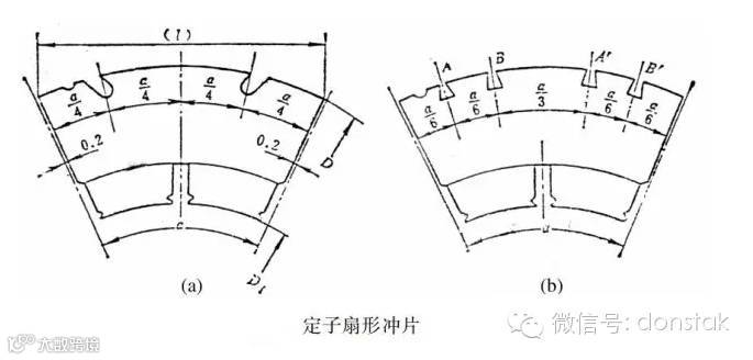 这种冲片虽外形为相似的扇形,但因其叠压方式不同而有多种不同外观形式。常见的两种定子扇形冲片,如图5所示。