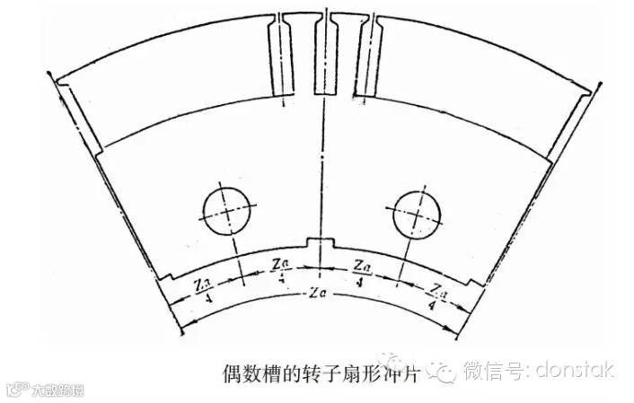 转子铁心直径大于1180mm时,采用扇形冲片拼装。图6所示为偶数槽转子扇形冲片(α为相邻两槽间夹角,z为每张扇形片的槽数)。图7为奇数槽转子扇形片。图8所示为常用的三种旋转电枢扇形片结构。