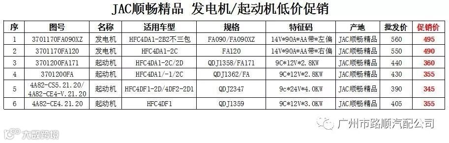 导读:广州市路顺汽车配件有限公司是安徽江淮汽车集团股份有限公司的华南地区的销售中心,以下JAC顺畅精品 发电机和起动机将于9月15日至10月15日期间低价促销,质量保证,欢迎广大客户朋友来电咨询采购!