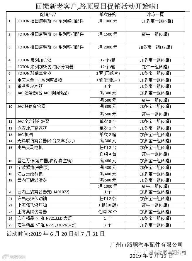 导读:为答谢广大客户朋友们一直以来的支持,广州市路顺汽车配件有限公司将于6月20日至7月31日期间进行好礼相赠夏日促销活动 !