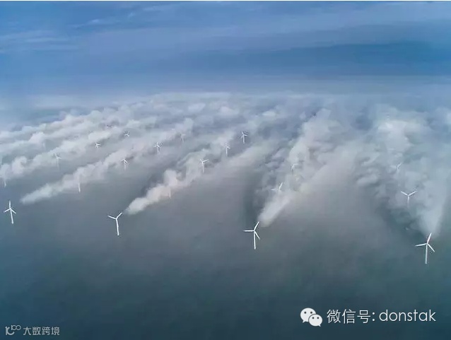 这张航拍照片显示的是丹麦海域的“号角礁”(Horn Rev)远岸海上风力发电站,距离陆地15公里。一期工程建成于2002年,由80个发电机组成,装机容量160MW,叶轮直径80米、中轴高70米、相邻中轴距离560米。由于天气和海浪不稳定,维护人员的主要交通工具是直升机。