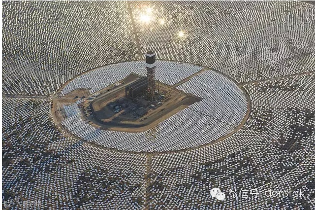这张照片是位于美国加州莫哈维沙漠的伊万帕太阳能发电站,计划总发电量为392MW。和光伏电池发电不同,这是一个太阳能热电站——173500个高效镜子将阳光反射到140米的高塔顶端,产生的热量驱动蒸汽轮机发电。某种意义上,这是阿基米德用镜子烧毁战船传说的复兴。不过路过的飞鸟就要倒霉了。