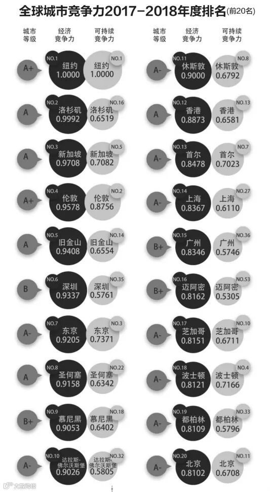 2016年全球城市经济竞争力指数十强:纽约、洛杉矶、新加坡、伦敦、旧金山、深圳、东京、圣何塞、慕尼黑、达拉斯。中国顶级城市表现良好,经济竞争力指数前20强中,深圳排名第6、香港排名第12、上海排名第14、广州排名第15、北京排名第20。