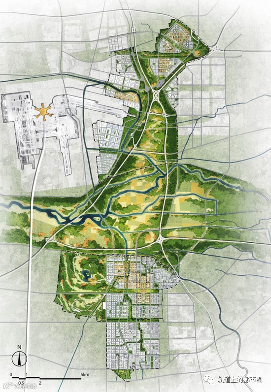 形成“水脉纵横、田园生态、穿插绿廊、紧凑组团”的平面布局。突出临空区生态绿廊、河渠众多的特点,塑造水系交错、农田景观围绕的城市本底;结合水渠及绿廊、绿道形成被蓝绿空间包围的多个组团,体现布局紧凑的空间肌理。