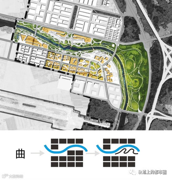 组织“曲廊”空间肌理。航企发展核心区是以滨水商旅服务为功能特点的地区,设计以“曲廊”肌理体现滨水的灵动、商旅的活跃,并建立与滨水空间的联通。