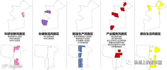 北京大兴国际机场临空经济区廊坊片区城市设计根据功能特征划分科研创新风貌区、仓储物流风貌区、制造生产风貌区、产业服务风貌区、居住生活风貌区5大功能风貌区。