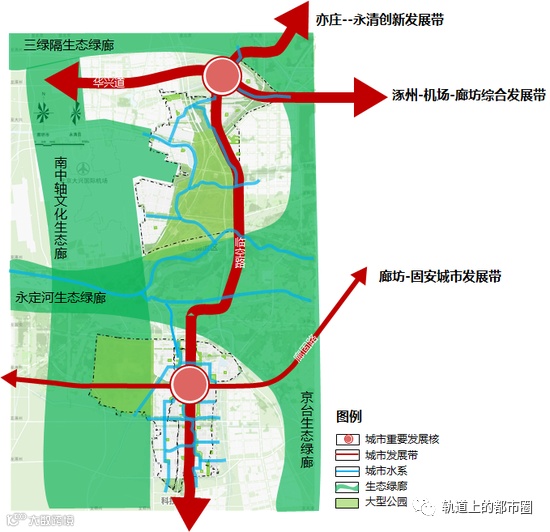 构建“四廊、三带、双核、双园、多绿道”的空间结构。以南中轴文化生态廊、京台生态绿廊、永定河生态绿廊、三绿隔生态绿廊四条廊道为基底,构建亦庄--永清、涿州-机场-廊坊、廊坊—固安等三条发展带,与多条慢行步道和滨水绿带一起串联南北双核双园,形成整体空间风貌结构。
