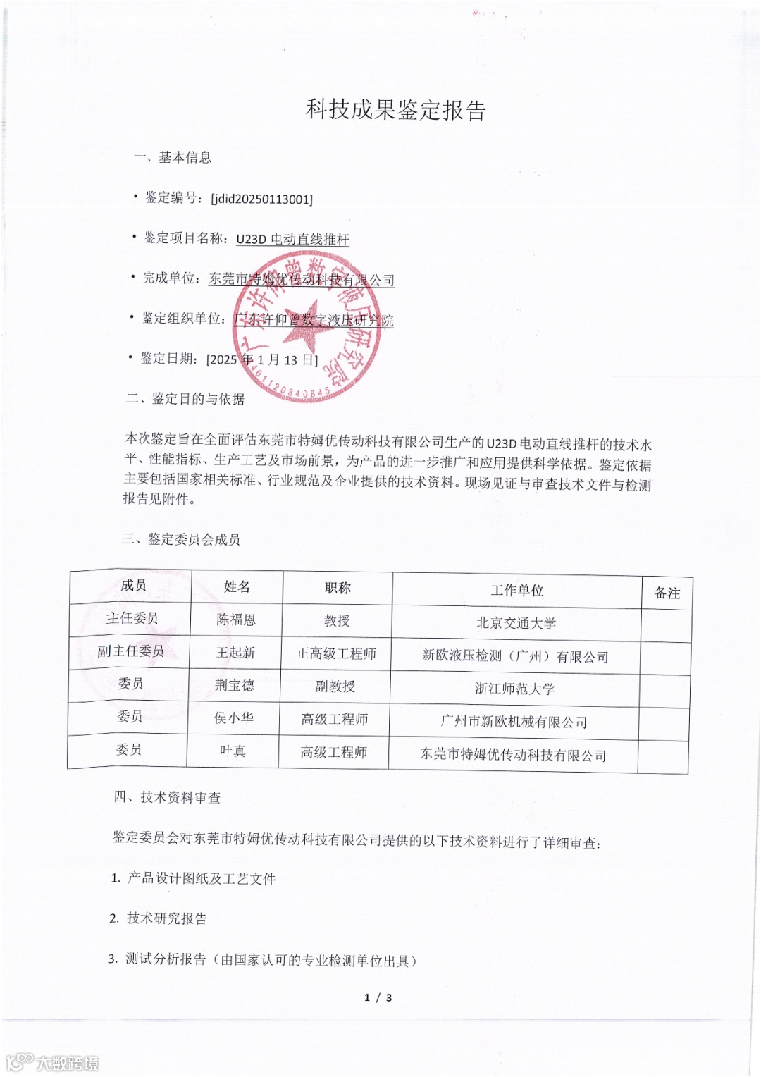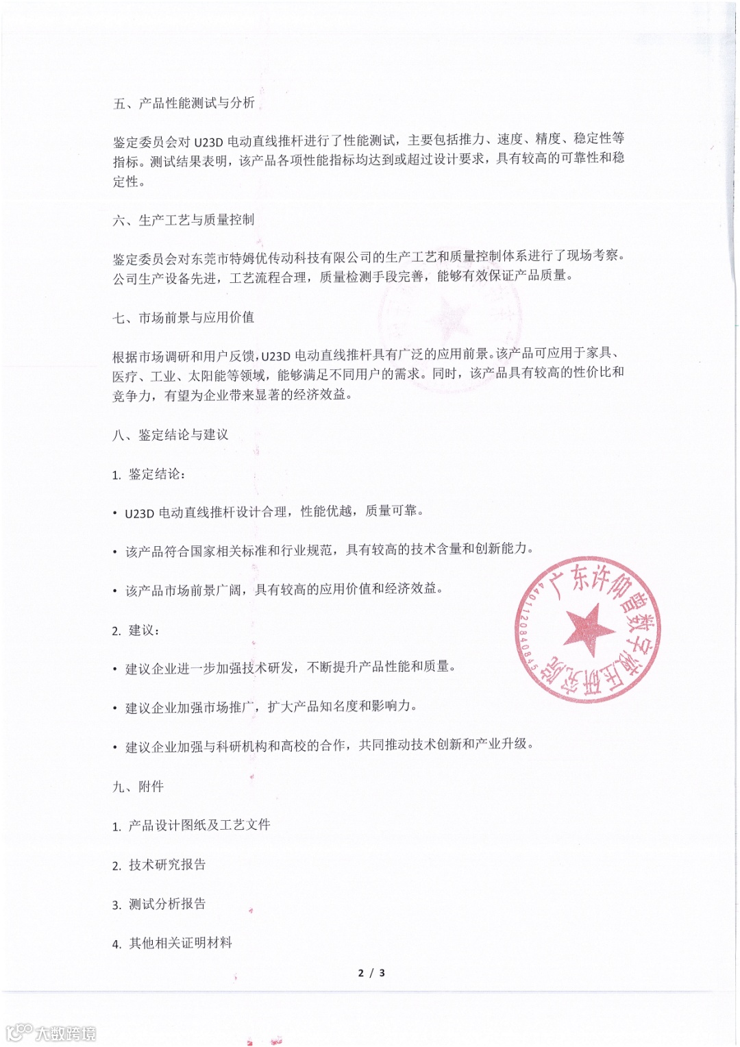 本次鉴定旨在全面评估东莞市特姆优传动科技有限公司生产的U23D电动直线推杆的技术水平、性能指标、生产工艺及市场前景,为产品的进一步推广和应用提供科学依据。鉴定依据主要包括国家相关标准、行业规范及企业提供的技术资料。现场见证与审查技术文件与检测报告见附件。