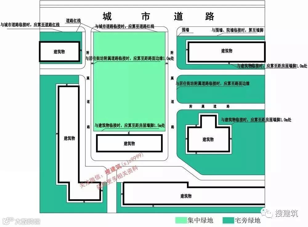 3 当集中绿地与城市道路临接时,应算至道路红线;当与居住街坊附属道路临接时,应算至距路面边缘1.0m处;当与建筑物临接时,应算至距房屋墙脚1.5m处。