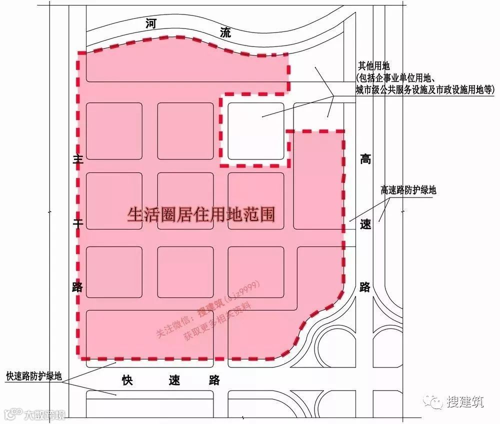 (各级生活圈算至道路中心线,居住街坊算至道路红线)