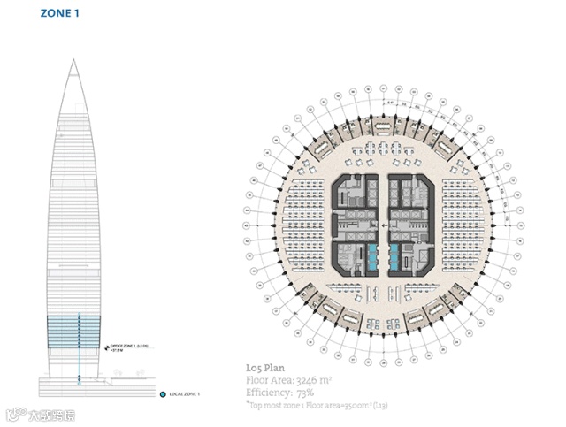 钢密柱框架+混凝土核心筒的结构使得大厦内打造出无柱开放式楼层平面变得可行,塔楼平面最终表达出环形放射对称布局。56根立柱,间距2.4~3.8米,柱子外边宽度30~40厘米,典型楼层的直径从最底部的60m扩展到腰部的68米再在顶部收至35米。