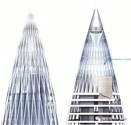 56根立柱在底部及顶部汇斜交汇聚成28根,大厦底部和塔顶采用多面三角形玻璃面板,打造雕塑般的外形。