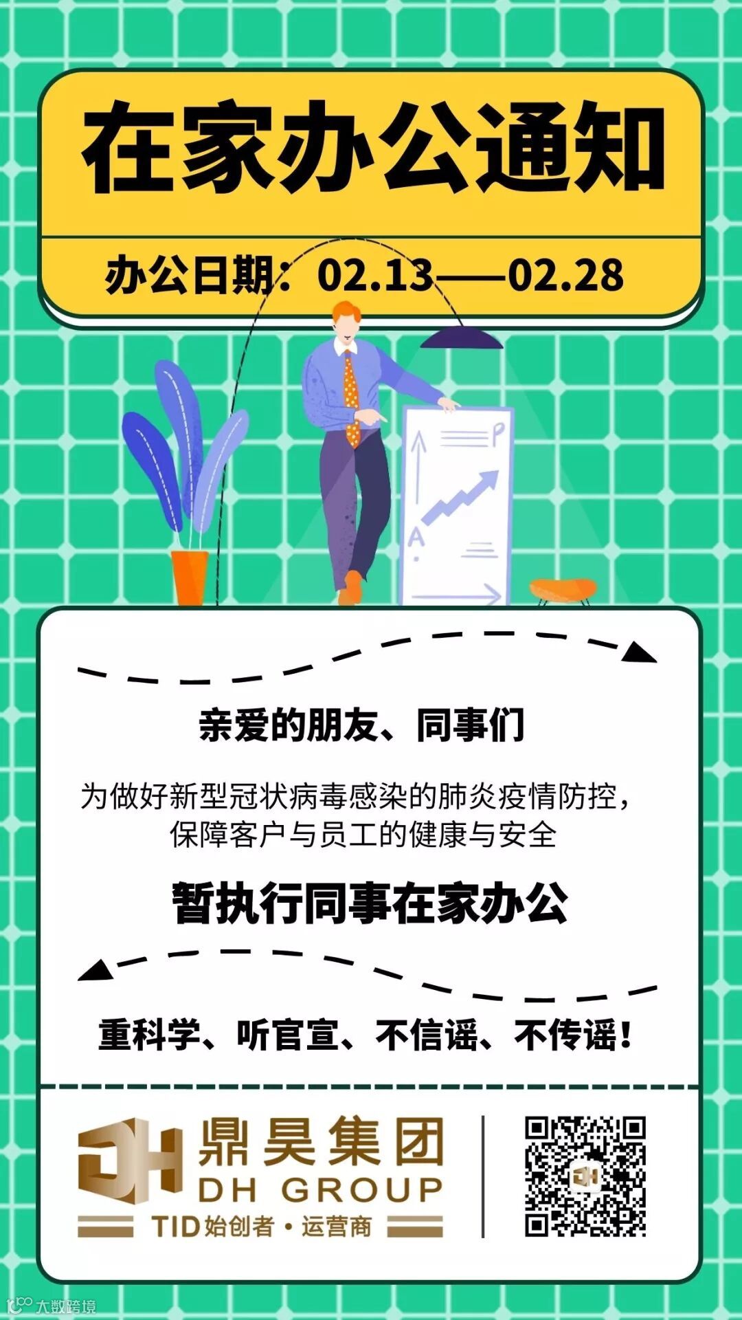 因受疫情影响,为所有同事的安全及健康考虑,鼎昊研究决定,暂定2月13日起至2月28日采取居家办公的工作模式。