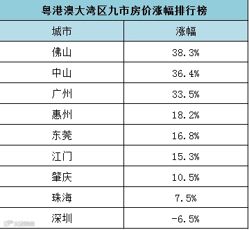 2017年1-12月,大湾区9市房价涨幅排名前三的是佛山、中山以及广州,涨幅分别是38.3% 、36.4%、33.5%,紧随其后的则是惠州、东莞、江门等。