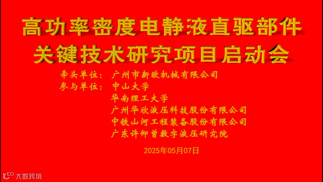 2025年5月7日上午,由广州市新欧机械有限公司牵头,联合中山大学、华南理工大学、华欣液压、中铁山河、许仰曾数字液压研究院等多家单位共同承担的广州市2025年度国家重点研发计划“递补支持”专题(高新技术方向)项目——“高功率密度电静液直驱部件关键技术研究”启动会在广州隆重举行。来自高校、科研院所及企业的专家代表齐聚一堂,共同见证这一国产高端液压技术攻关项目的正式启动。