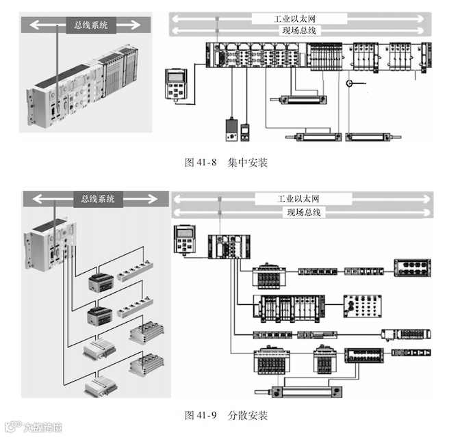 (2)现场总线型/可编程智能型阀岛 为了满足大型模块化生产线设备的要求,现场总线型/可编程智能型阀岛正在逐渐普及并广泛地投入使用。如图41-3b所示,与PLC 控制器通信的现场总线节点,以及与之衔接的输人/输出模块是一个个独立的,可以方便拆卸、快速更换与扩展的模块,如果阀岛需要使用不同的现场总线协议与不同的PLC 控制器通信,只需要更换该阀岛上的总线节点以及相应的总线接口的插头即可;此外,这些模块化的输入/输出模块集成在阀岛上,直接安装在生产设备上,因此现场的输入/输出信号装置,如安装在气缸上用来检测活塞位置的接近开关,或者需要精确工作压力且可以随时任意调节的比例调压阀等,都可以直接用相应的连接电缆连接到阀岛的输入/输出模块上。这些都有效缩短了现场生产设备的输入/输出装置到控制柜内 PLC控制器的连接电缆的距离,降低了布线安装的工时、人力与成本。
